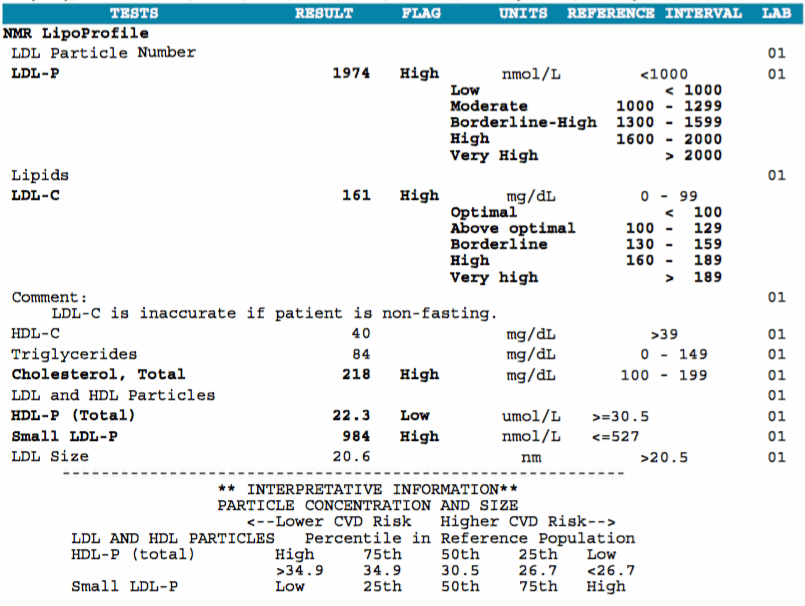 Update – I didn’t do an NMR this time around, because I haven’t shown a discordant LDL-C/P pattern. After 45-50 days of changing my diet, my LDL-C went down from 171 to 142, and my HDL-C went up from 39 to 41. My total cholesterol to HDL ratio is at 5.0 down from 5.9. That’s as low of an LDL as I’ve ever had, so I think it might be working!